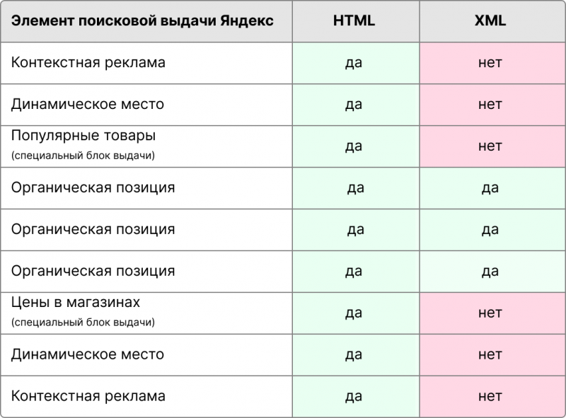 Очевидно, HTML позволяет получать более полные данные. В этом легко убедиться самостоятельно – сопоставить данные о выдаче, полученные в Search API в формате XML и HTML, для одного и того же запроса, в одном и том же регионе, в одно время.