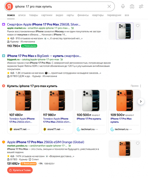 Например, сравним данные о выдаче для запроса «iphone 17 pro max купить», гео – Москва, данные по выдаче на десктопе, время сбора — 20.12.2025, 09:20
