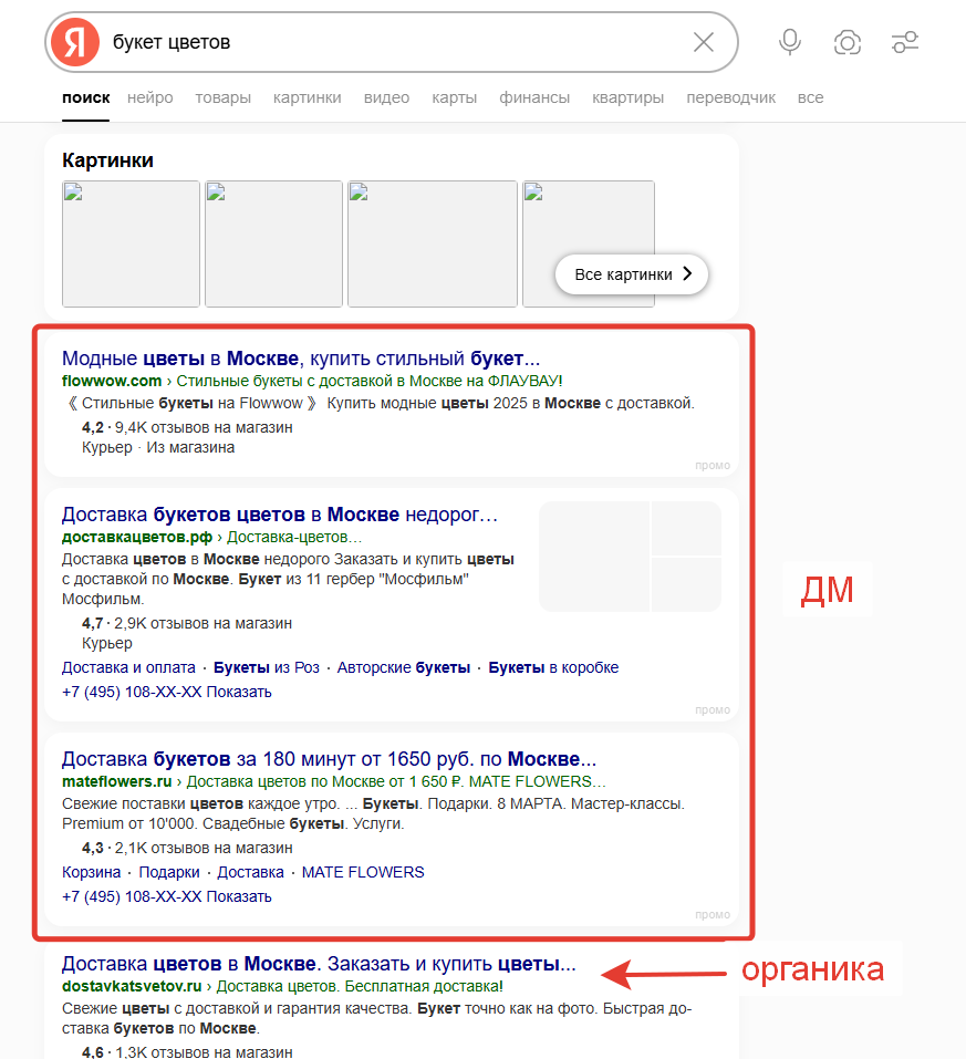 - Выявление каннибализации трафика. Органика «проседает». В HTML-слепке видно: над органикой стабильно стоят Динамические места. Это могут быть конкуренты, или же собственный PPC-отдел компании. В последнем случае SEO-команда может оперировать цифрами и показать, сколько запросов перекрыто рекламой, какая доля кликов уходит в ДМ, обсудить, где стратегии конфликтуют и как их развести. Это разговор уже не на уровне мнений, а на уровне данных.