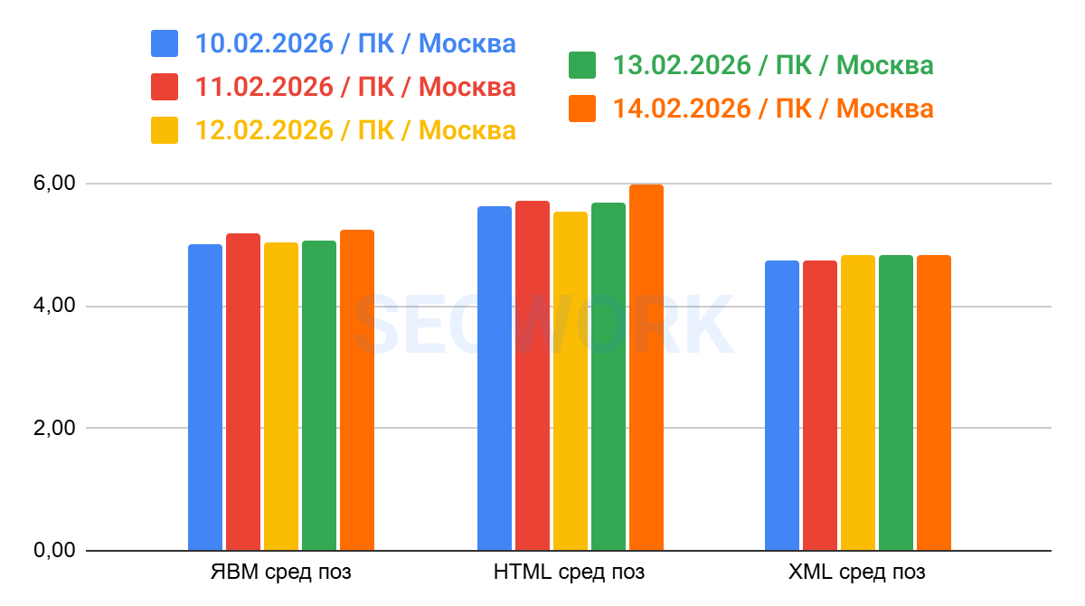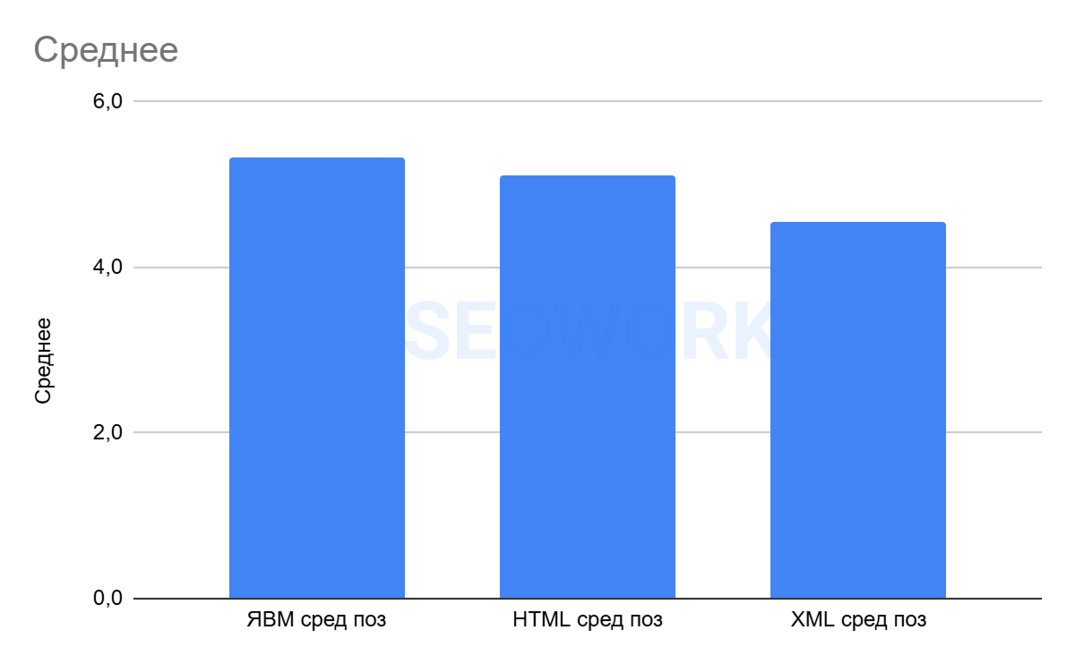 На графике отражено сопоставление данных по средней позиции из Яндекс Вебмастера, HTML (SEOWORK) и XML. Это усреднённые данные за всё время наблюдений