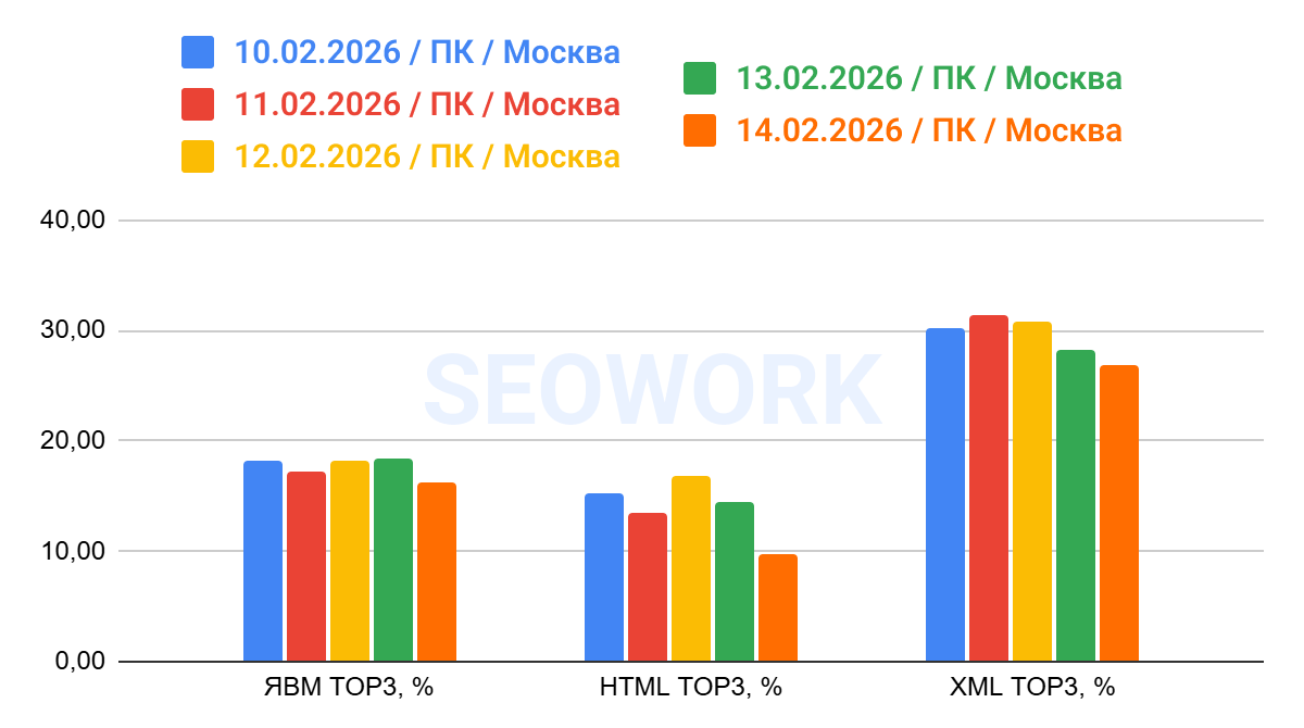 На графике отражено сопоставление данных по Топ-3 из Яндекс Вебмастера, HTML (SEOWORK) и XML. Это усреднённые данные за всё время наблюдений