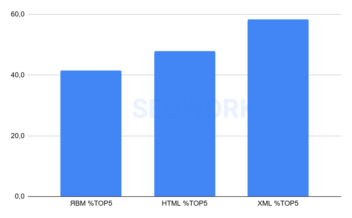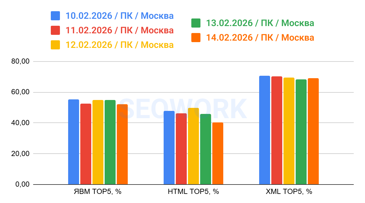 На графике отражено сопоставление данных по Топ-5 из Яндекс Вебмастера, HTML (SEOWORK) и XML. Это усреднённые данные за всё время наблюдений
