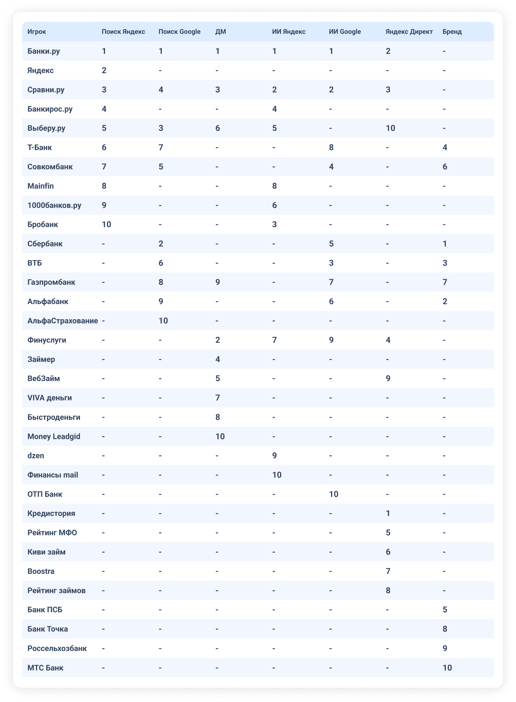Рейтинг по всей отрасли доступен в сводной таблице и как мы видим, расстановка в нем отличается от расстановки сил в нише Кредитных продуктов.