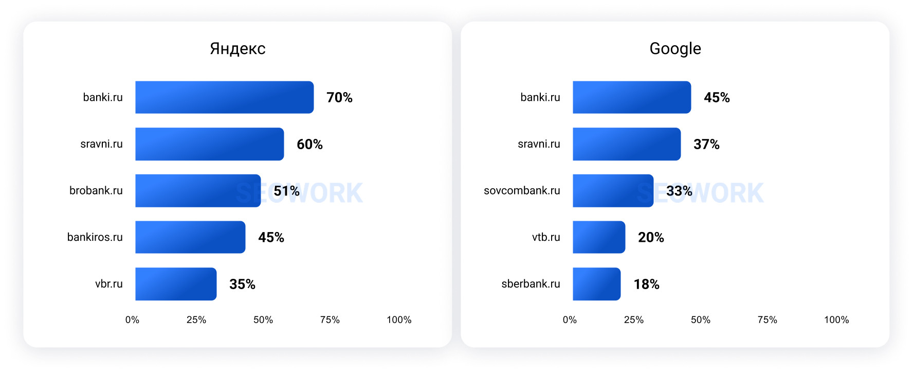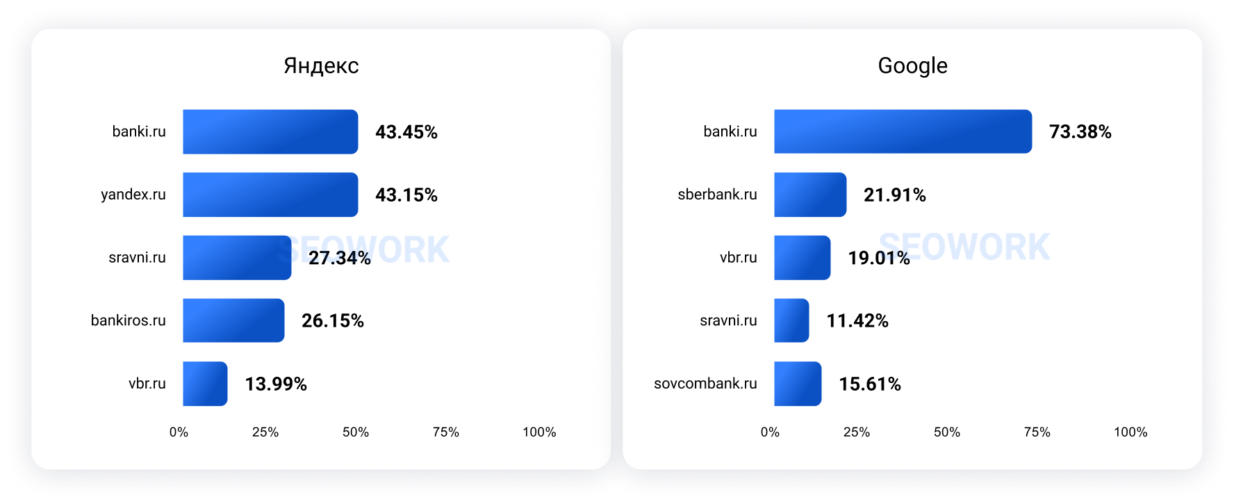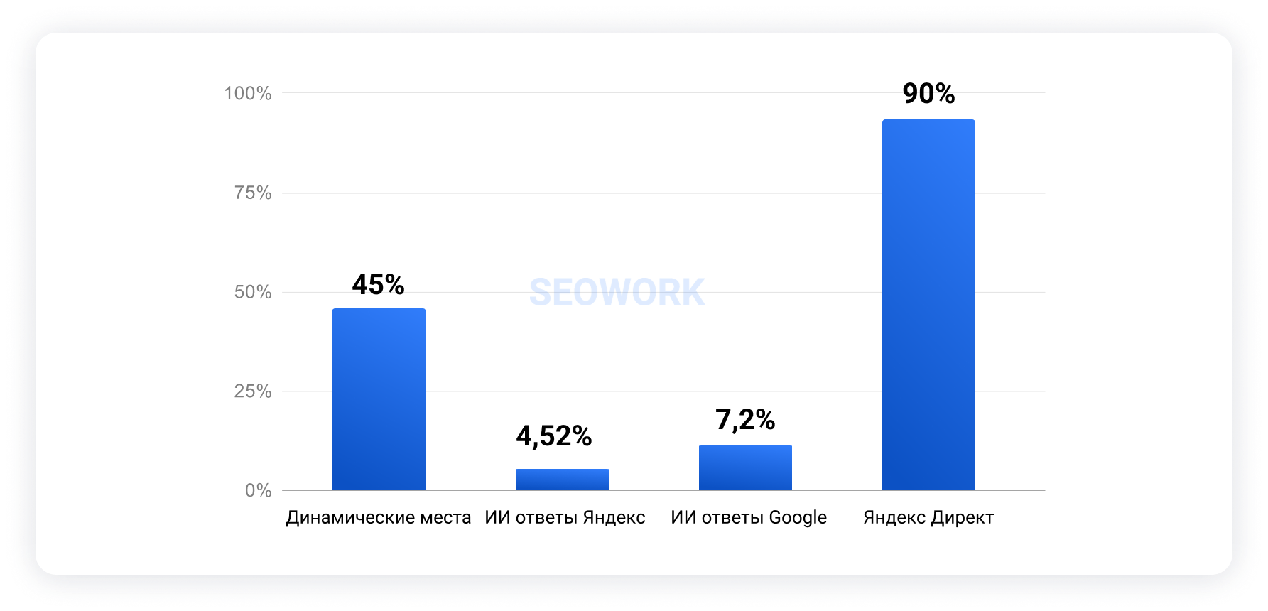 Отраслевые рейтинги SEOWORK формируются на больших данных на базе аналитических продуктов: SEOWORK (органическая выдача), DataForce ADS (реклама и динамические места) и DataForce AI (блоки выдачи с ИИ ответами).
