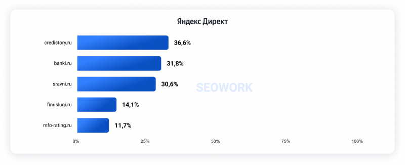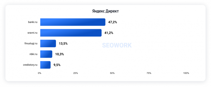 Рейтинг строится на основе метрики SOI и показывает долю аудитории, которая видит рекламные объявления на первых трех строчках Директа.