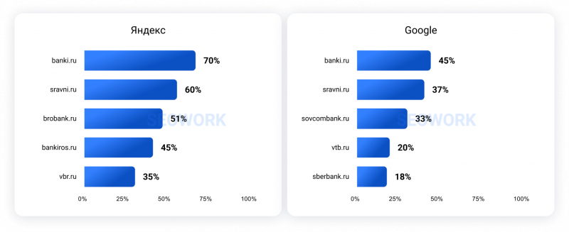 Мы подобрали и проанализировали более десятка тысяч поисковых запросов, относящихся к финансовому сектору. Также мы группировали запросы по более узким направлениям – это позволило более прицельно изучить выдачу для разных финансовых продуктов и услуг. В качестве примера в этой статье мы отдельно приведем данные по кредитным продуктам.