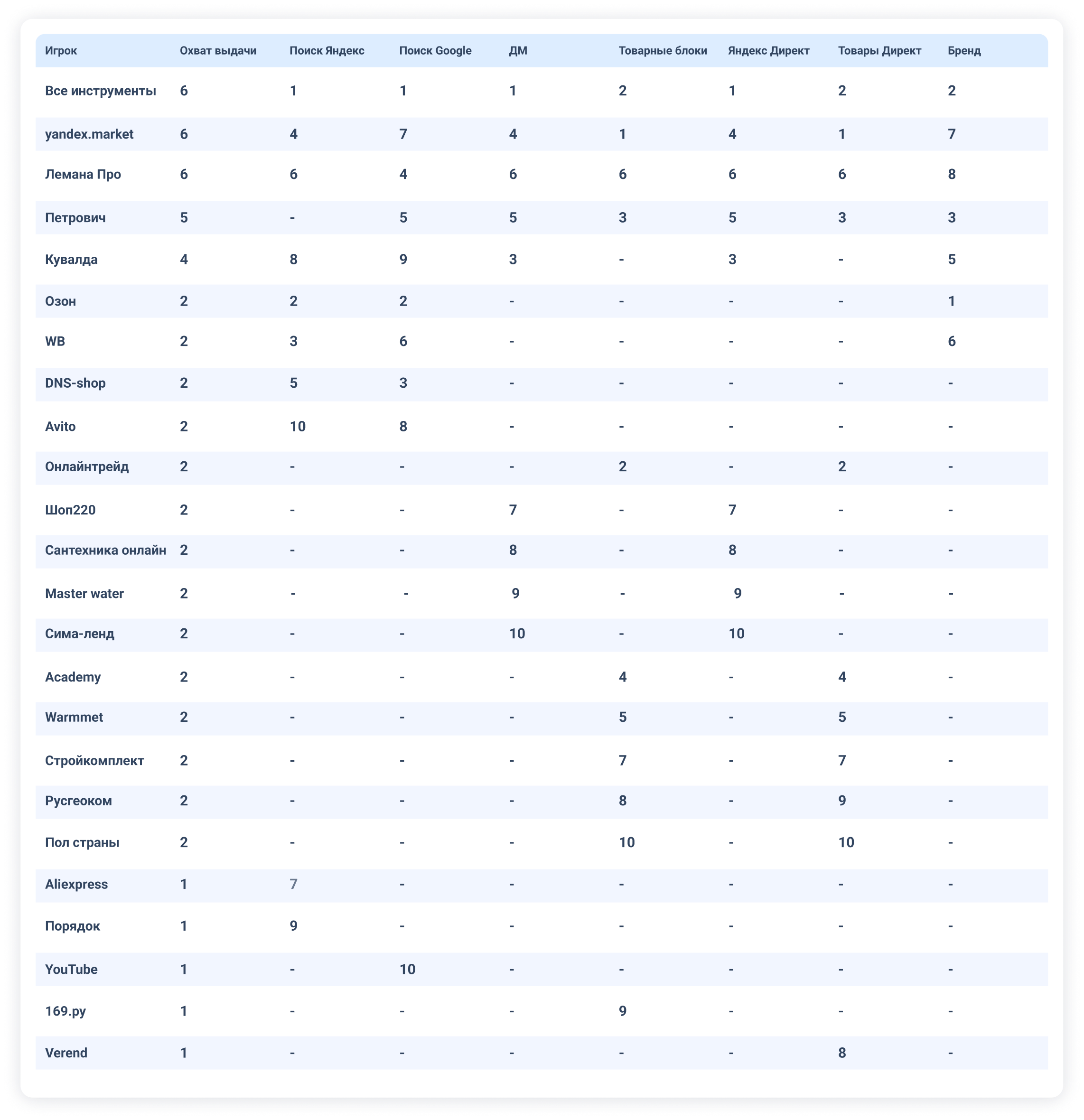 Рейтинг построен по оценке «Охват выдачи» – это число элементов выдачи различного типа, в которых встречается проект. То есть если у проекта проставлены оценки, например, в Поиске Яндекс, Поиске Google и ДМ, Охват выдачи будет равен 3-м. Популярность бренда в охвате выдачи не учитывается.