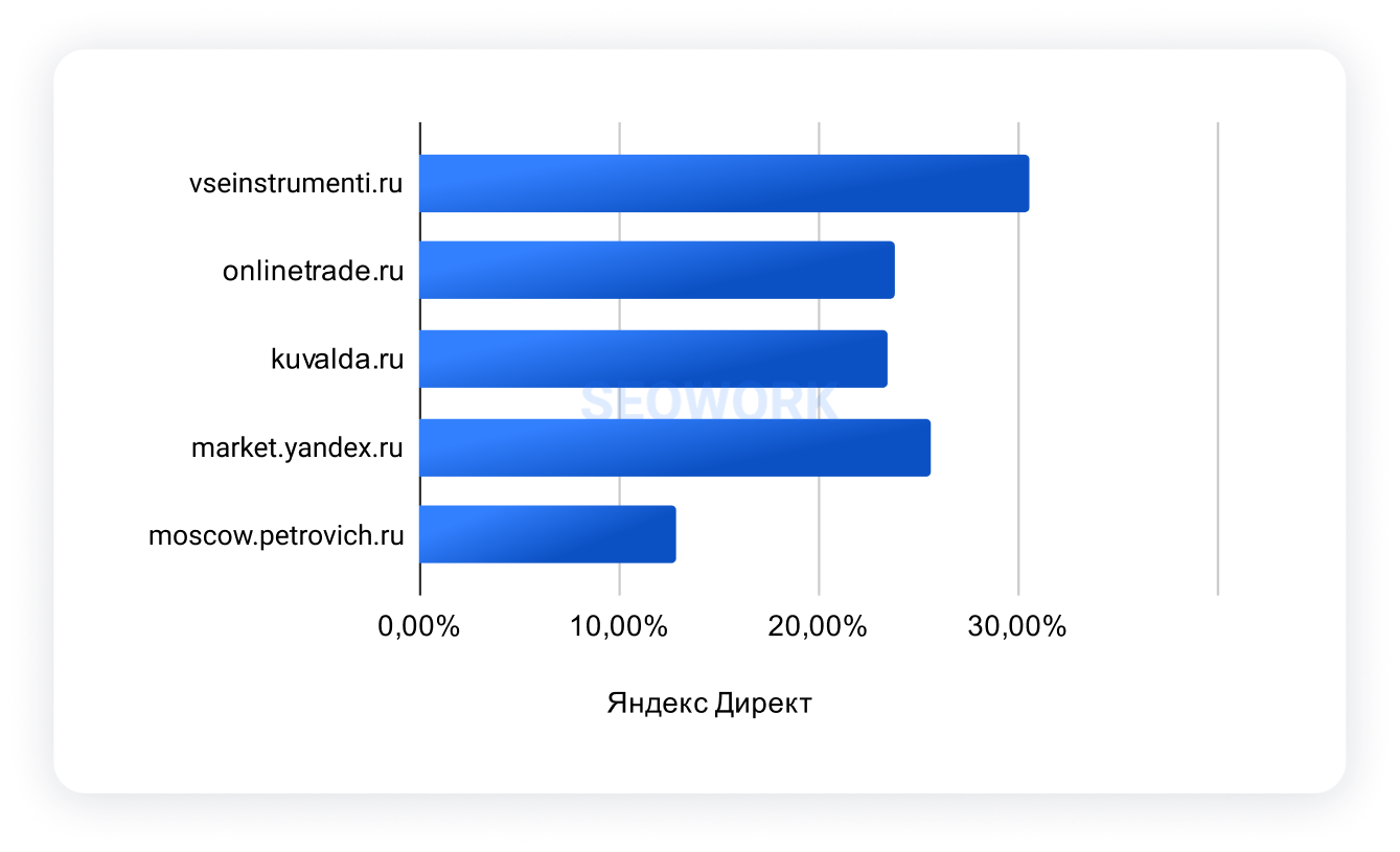 Рейтинг строится на основе метрики SOI и показывает долю аудитории, которая видит рекламные объявления на первых трех строчках Директа.