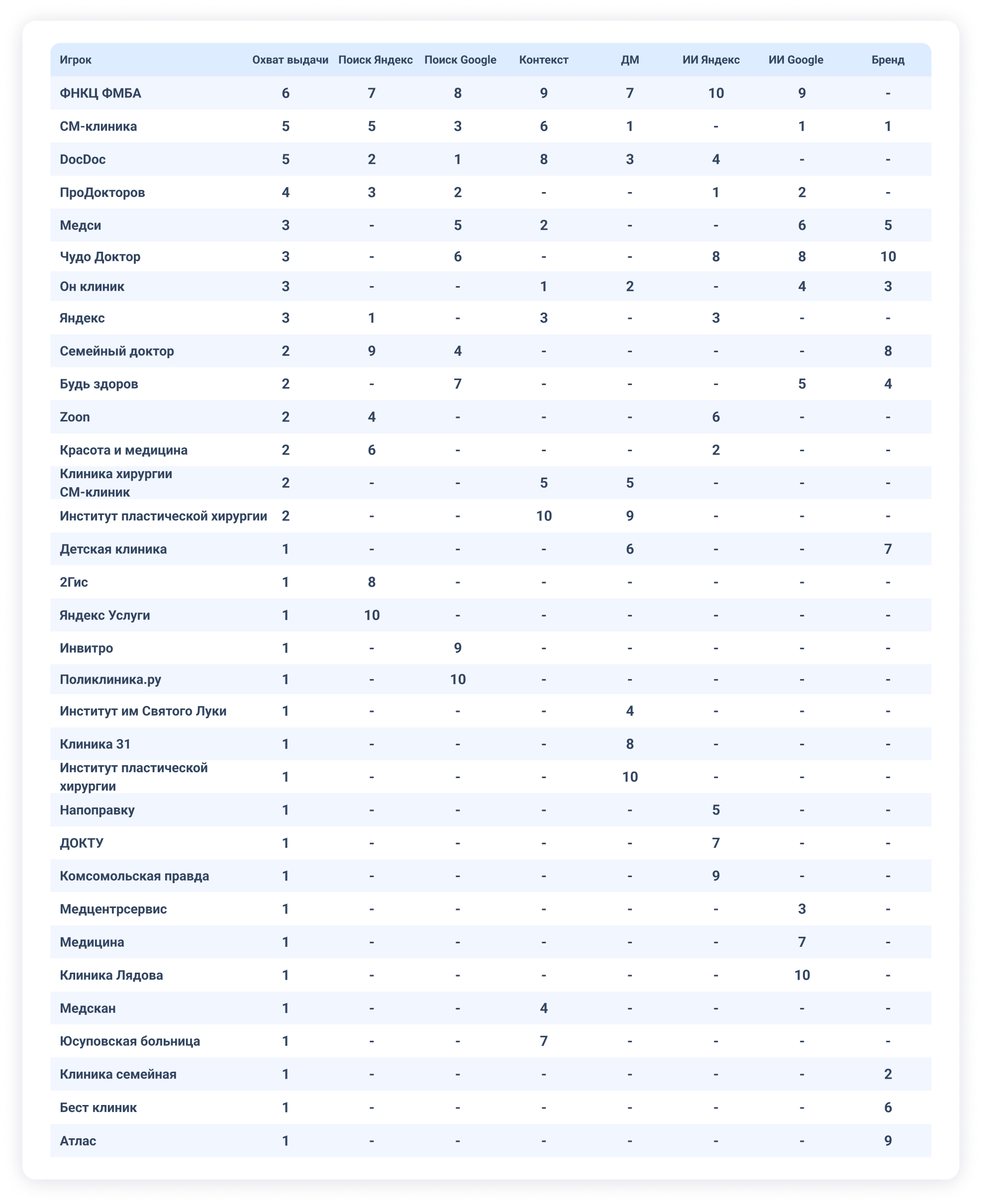 Полный отраслевой рейтинг в нише «Медицинские клиники»