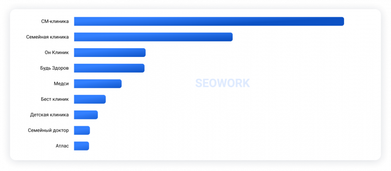 Отражает спрос по запросам, связанным с конкретным брендом и его услугами. То есть бренды этих медицинских клиник запрашивали москвичи в ноябре в поисковиках чаще всего