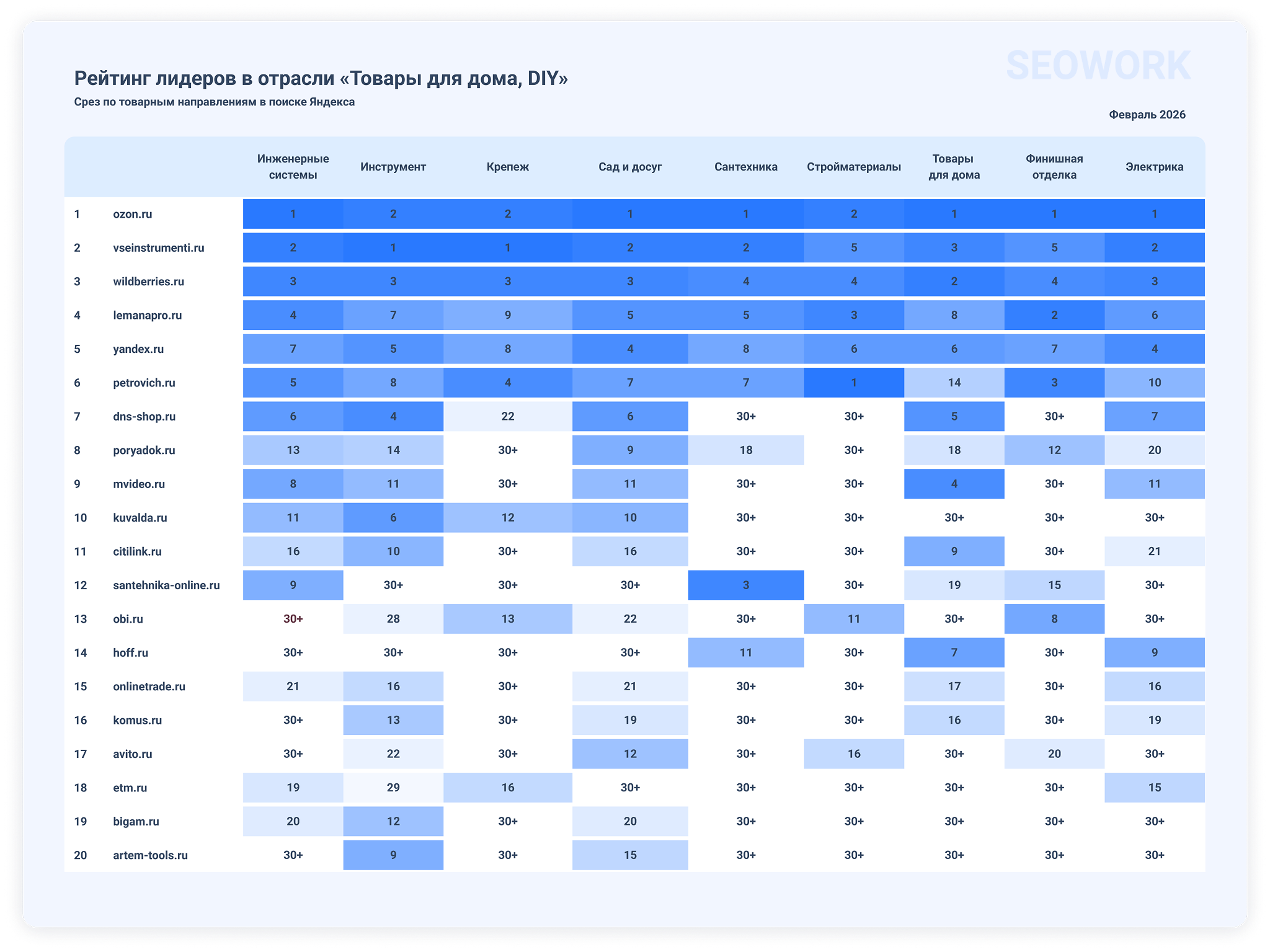 В рейтинге мы собрали лидеров поисковой выдачи в отрасли Товаров для дома (DIY) за февраль 2026 года и сравнили, как игроки представлены в разных блоках поисковой выдачи. Такой срез помогает увидеть не только тех, кто стабильно получает максимальную видимость, но и компании, которые усиливают позиции за счёт отдельных форматов — например, рекламы.