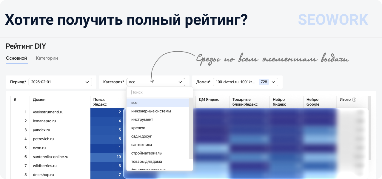 Рейтинг показывает, что лидерство в отрасли DIY формируется не в одном канале, а сразу в нескольких элементах поисковой выдачи. Сильные игроки — это, как правило, сайты, которые стабильно присутствуют сразу в органике, рекламных форматах, товарных блоках и, в ряде случаев, в ИИ-ответах.