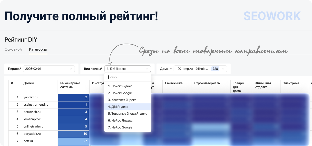 Исследование будет полезно маркетологам, digital-специалистам, SEO-командам и ecommerce-менеджерам, которые отвечают за поисковое продвижение и хотят понимать, где в отрасли сосредоточена конкуренция и какие точки роста есть у проектов в поиске. Отраслевые рейтинги SEOWORK как раз решают эту задачу.