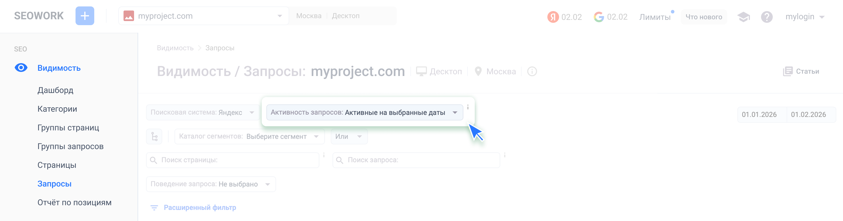 Теперь можно в любой момент увидеть всю активную семантику проекта, независимо от даты добавления запросов.